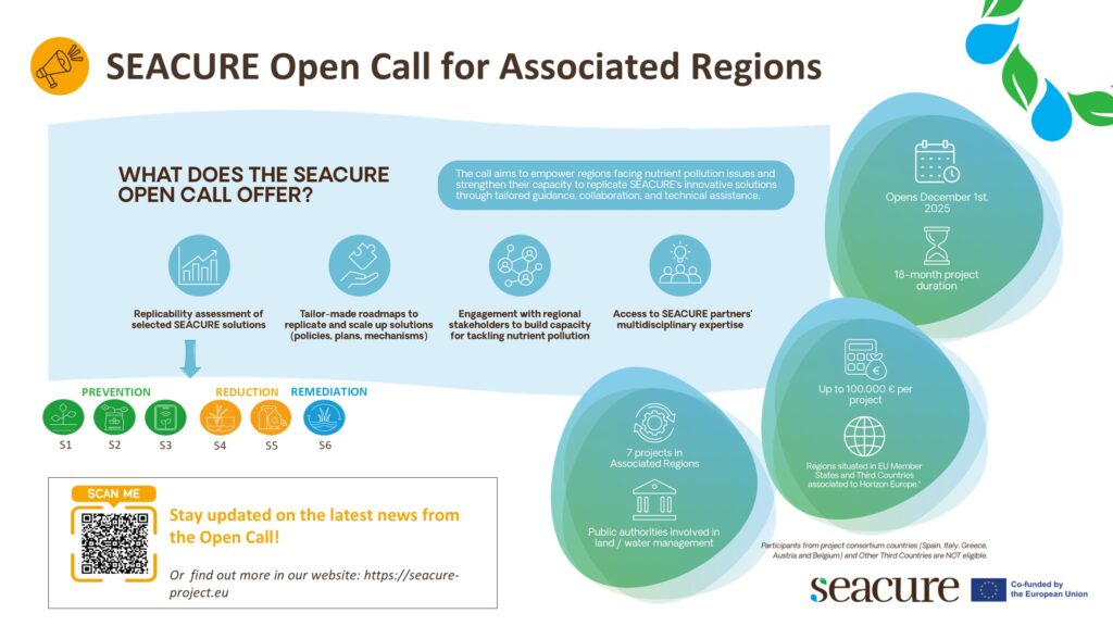The call invites up to seven regional and local authorities to access up to €100,000 and an 18-month support programme to build regional capacity for implementing SEACURE’s innovative nutrient-management solutions and advance action to reduce soil and water pollution in their basins.
